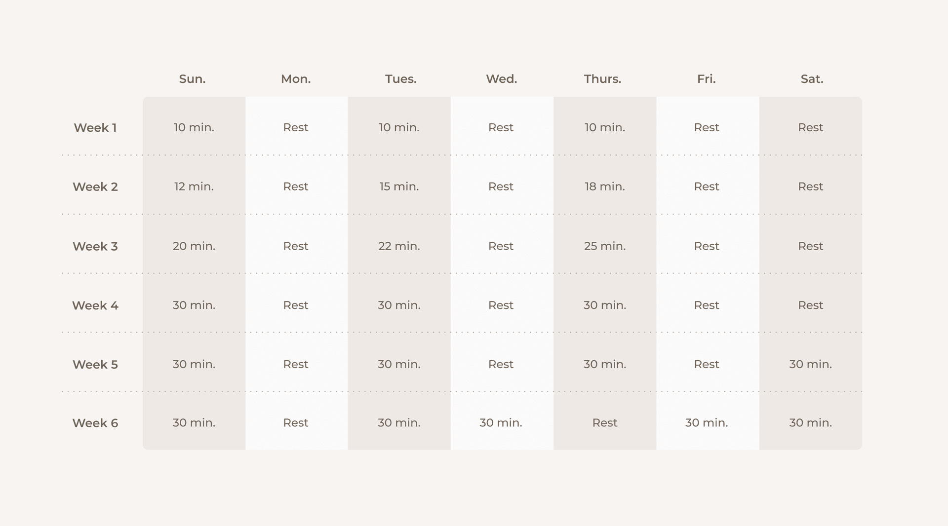 Once you’ve been cleared by your doc, start with a small amount of walking three days per week - try 10-15 minutes. Build the amount of time you’re walking by adding 2-5 minutes per walk until you can do 30 minutes, then add in another day of walking. After a week or two, add a fifth day of walking to your schedule. Here is an example: