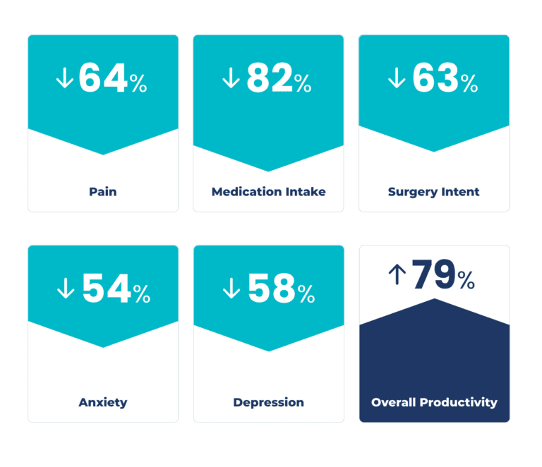 The overall results were quite impressive. As a group, the patients experienced a 64.3% drop in pain. Marked improvements were also noted in all secondary outcomes: 82% reduction in medication intake, 63% in surgery intent, 40% in fear-avoidance beliefs, 54% in anxiety, 58% in depression, and 79% improvement in overall productivity. The mean patient satisfaction score was 8.7 out of 10.